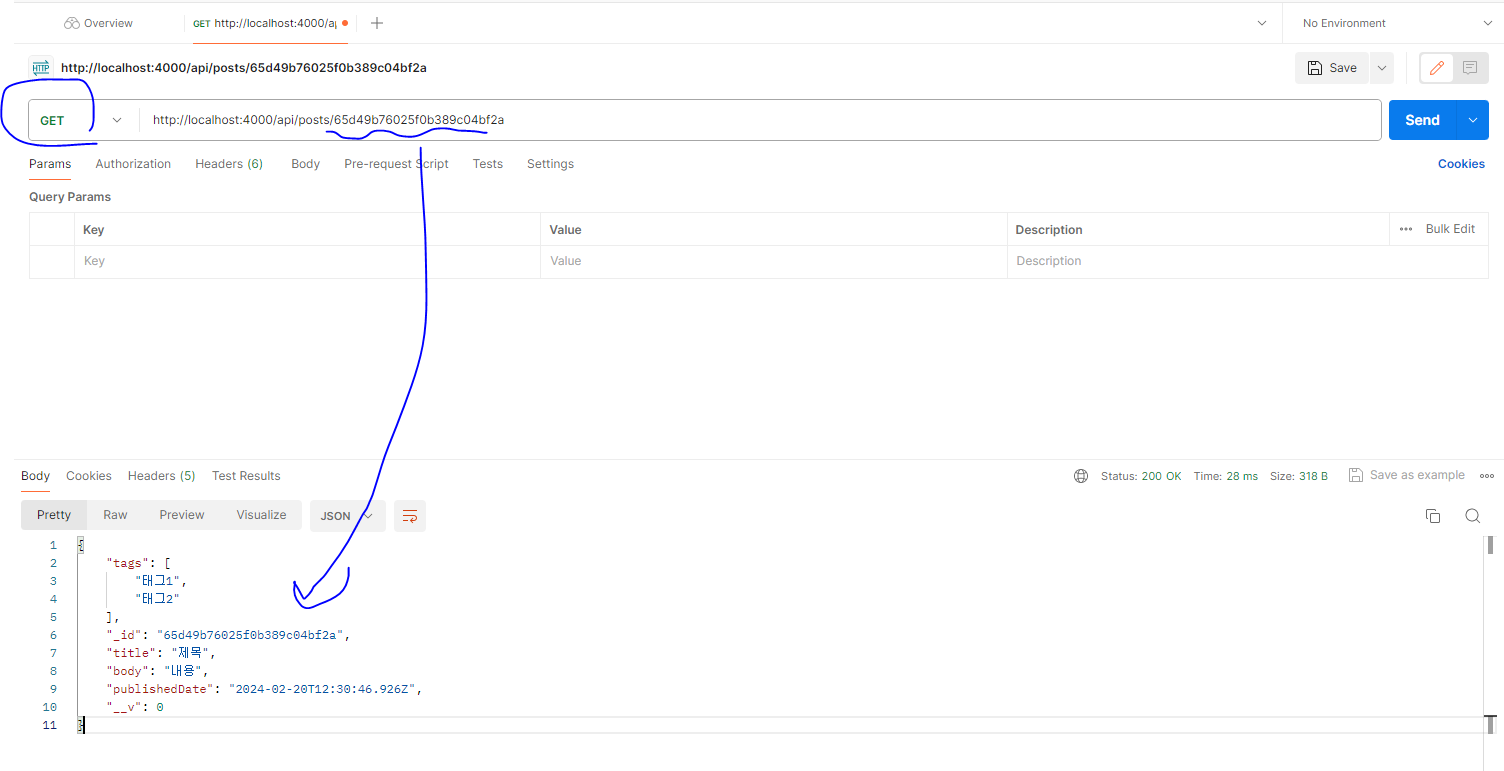* 코드를 저장하고, Postman을 사용하여 다음 요청을 전송해 보자. URL에서 id 부분에 넣는 파라미터는 이전에 포스트 목록을 조회했을 때 나왔던 id 중 하나를 복사해 넣자.
