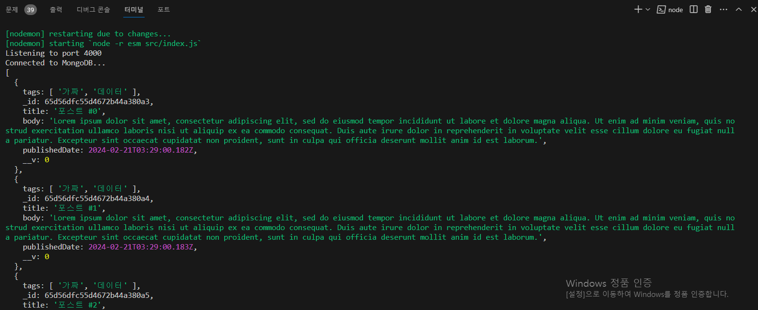 * 데이터가 잘 등록된 것을 확인했으면 createFakeData를 호출하는 코드를 main.js에서 지워 주자.