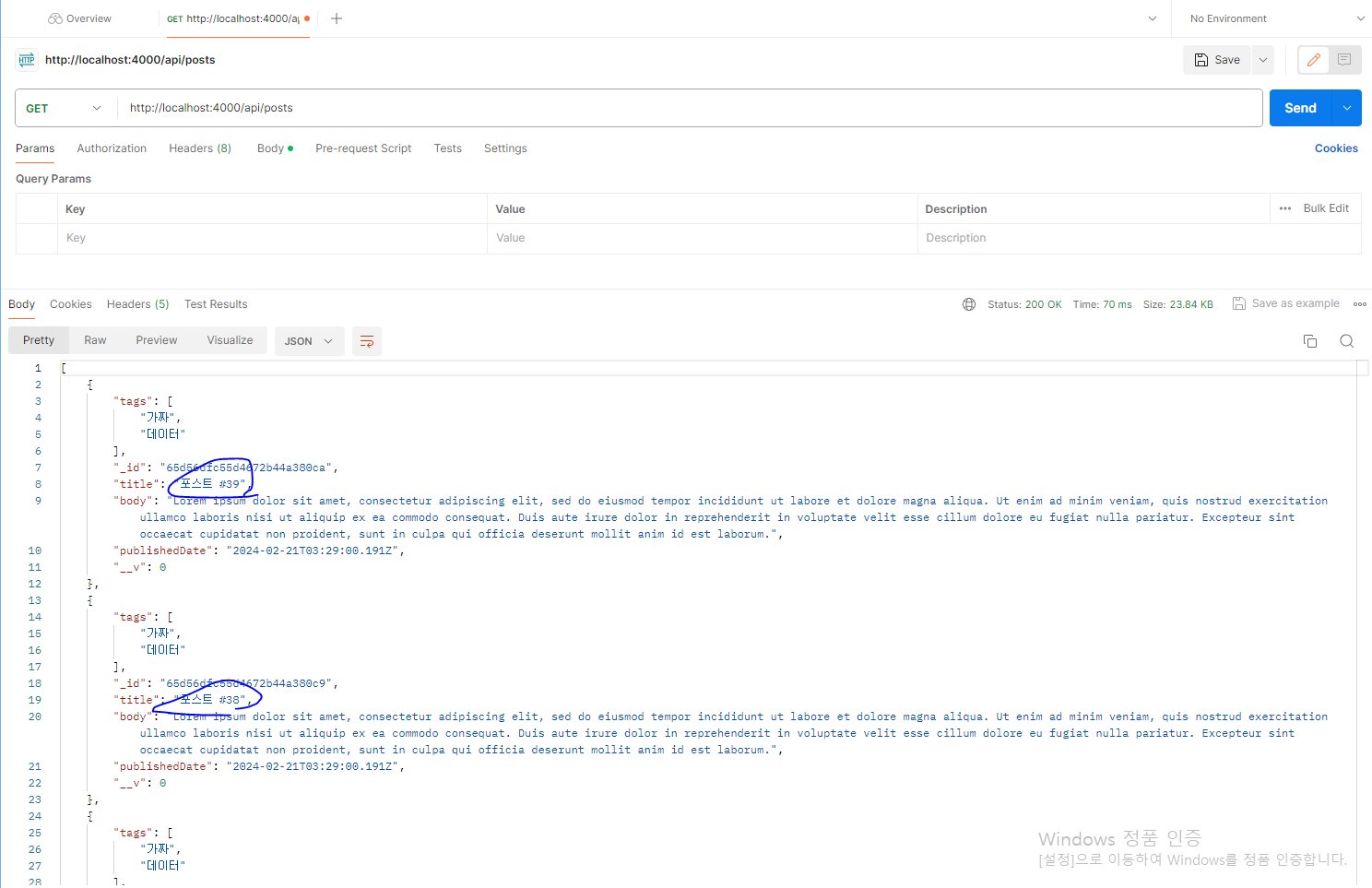 * 이제 Postman으로 list API를 요청하면 최근 작성된 열 개의 포스트만 불러올 것이다.