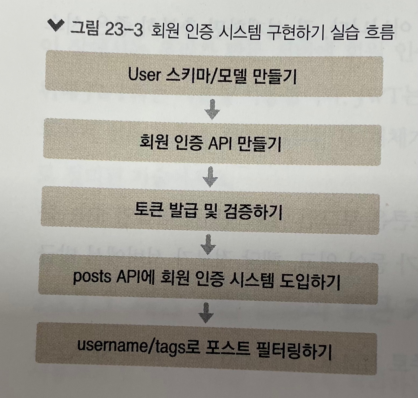 * 우리는 두 가지 시스템 중 토큰 기반 인증 시스템을 사용해 볼 것이다. 이 방식을 택한 이유는 인증 시스템을 구현하기 간편하고 사용자들의 인증 상태를 관리하기도 쉽기 때문이다. 앞으로의 실습은 다음 흐름으로 진행된다.