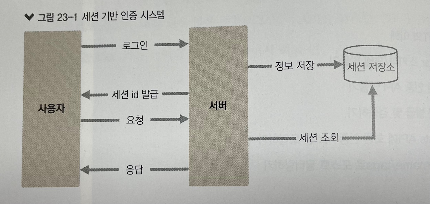 * 세션 기반 인증 시스템에서 사용자가 로그인을 하면, 서버는 세션 저장소에 사용자의 정보를 조회하고 세션 id를 발급한다. 발급된 id는 주로 브라우저의 쿠키에 저장한다. 그 다음에 사용자가 다른 요청을 보낼 때마다 서버는 세션 저장소에서 세션을 조회한 후 로그인 여부를 결정하여 작업을 처리하고 응답을 한다. 세션 저장소는 주로 메모리, 디스크, 데이터베이스 등을 사용한다.