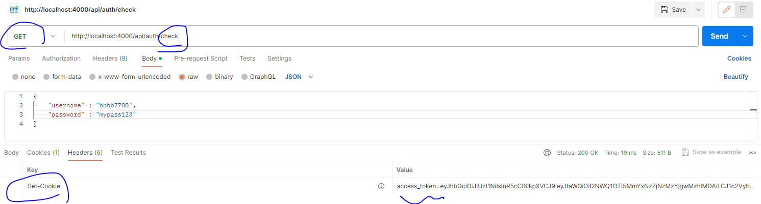 토큰 재발급이 잘 이루어진다면, check API를 요청했을 때 Headers 에서 새 토큰이 Set-Cookies를 통해 설정될 것이다.