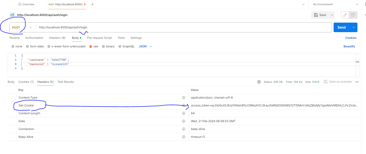 };* 이제 다시 Postman으로 로그인 요청을 하고, 응답 부분의 Headers 를 선택해서 확인해 보자. 다음과 같이 Set-Cookie라는 헤더가 보일 것이다.