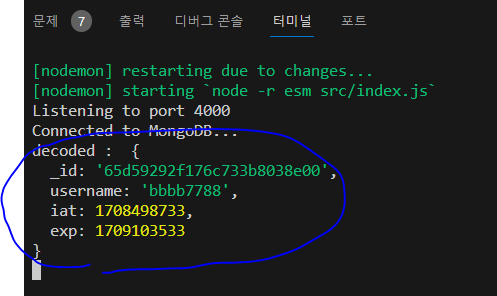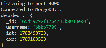 * jwtMiddleware를 통해 토큰이 해석된 이후에 다음과 같은 결과물이 출력되고 있을 것이다.
