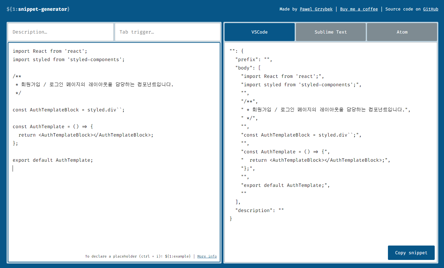 * 우선 Snippet으로 사용하고 싶은 코드를 복사하자. 방금 만든 AuthTemplate 코드를 복사하자. 그리고 브라우저에 https://snippet-generator.app/ 주소를 입력한 뒤 좌측 텍스트 박스에 코드를 붙여 넣자.