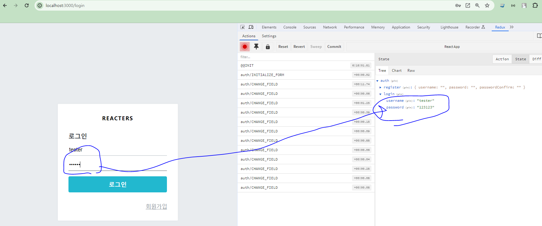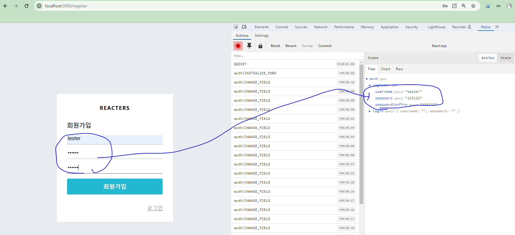 * 코드를 작성한 뒤 회원가입 폼에서 값을 입력할 때 리덕스에 값이 잘 반영되는지 확인해 보자.