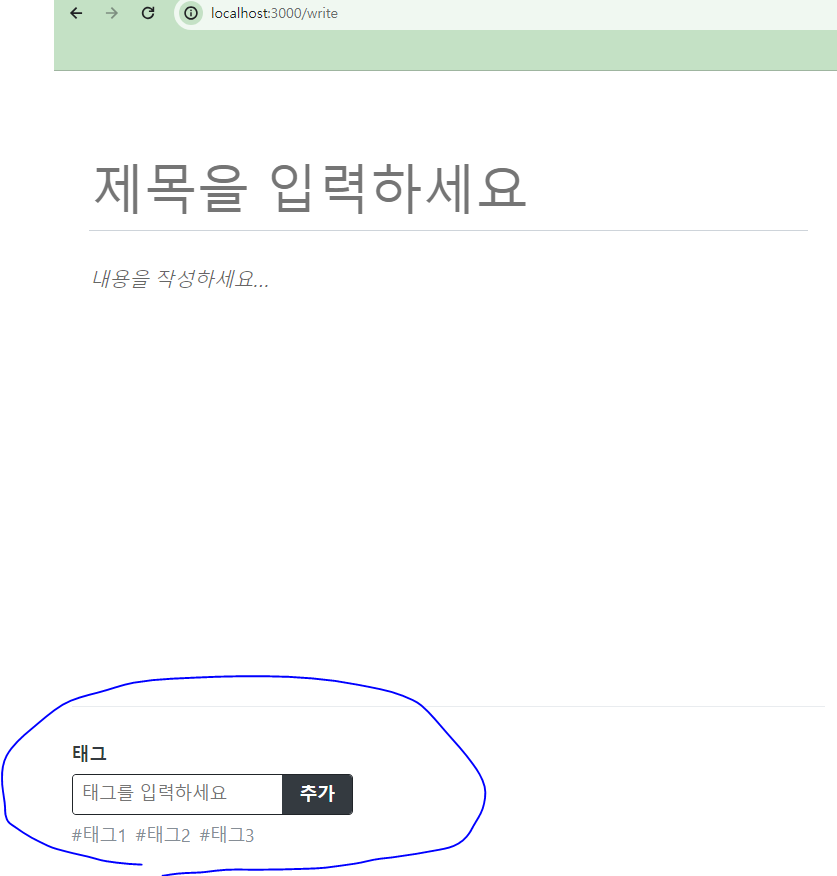 * 글쓰기 페이지에 필요한 모든 컴포넌트와 UI를 완성했다! 이제 화면에 다음과 같은 결과가 나타날 것이다.