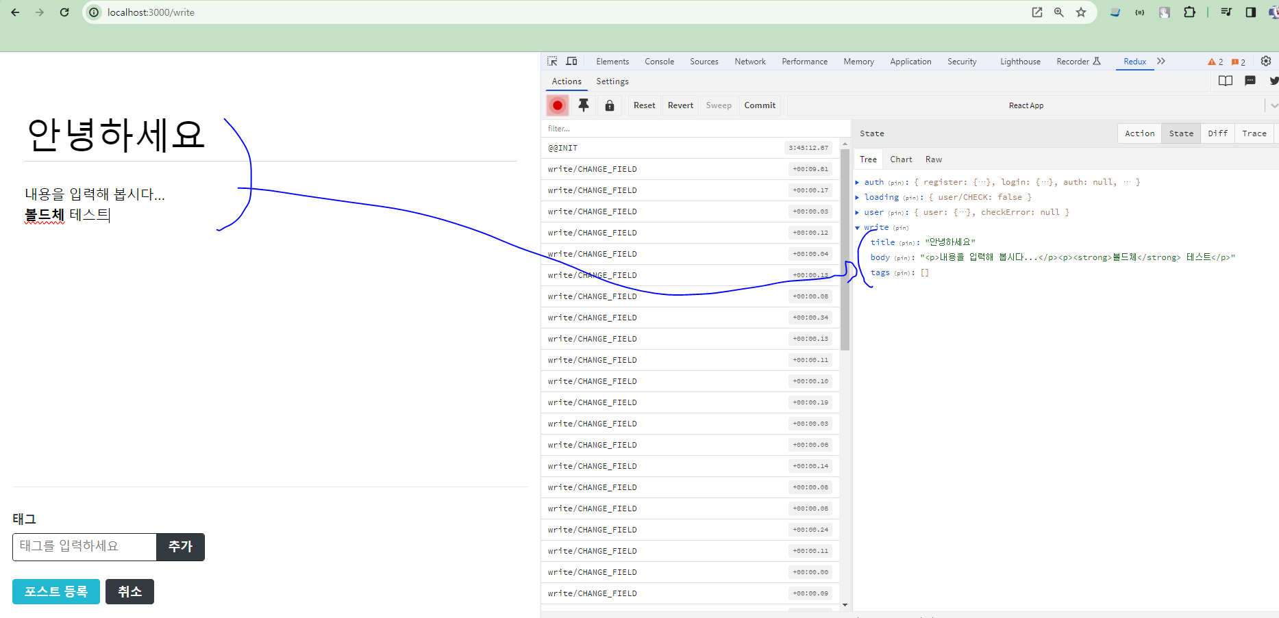 * 코드를 다 작성했는가? 브라우저에서 에디터 내용과 값을 입력해 보자. 그리고 리덕스 개발자 도구를 확인하여 에디터에 입력한 값이 스토어에도 그대로 반영되었는지 확인해 보자.