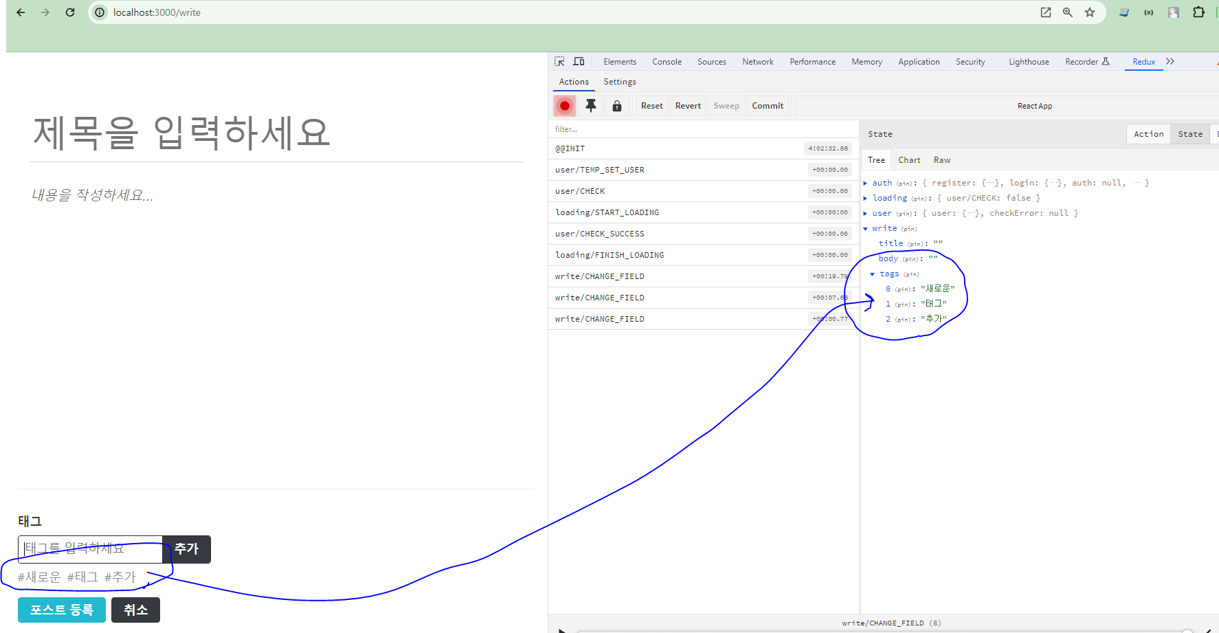 * 컴포넌트를 다 작성했으면 리덕스 개발자 도구를 열고 태그를 추가해 보자. 리덕스 스토어에 바뀐 내용이 잘 반영되는가?