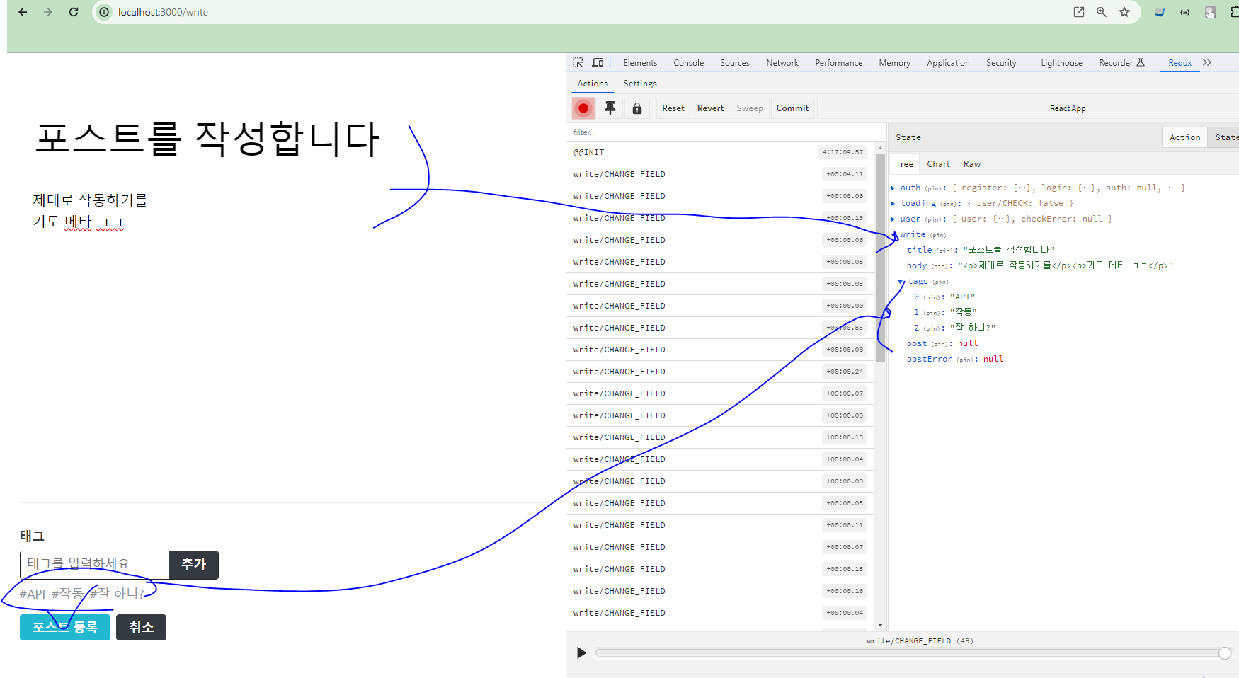 * 리덕스 모듈을 수정한 후 writeSaga를 rootSaga에 등록하자.