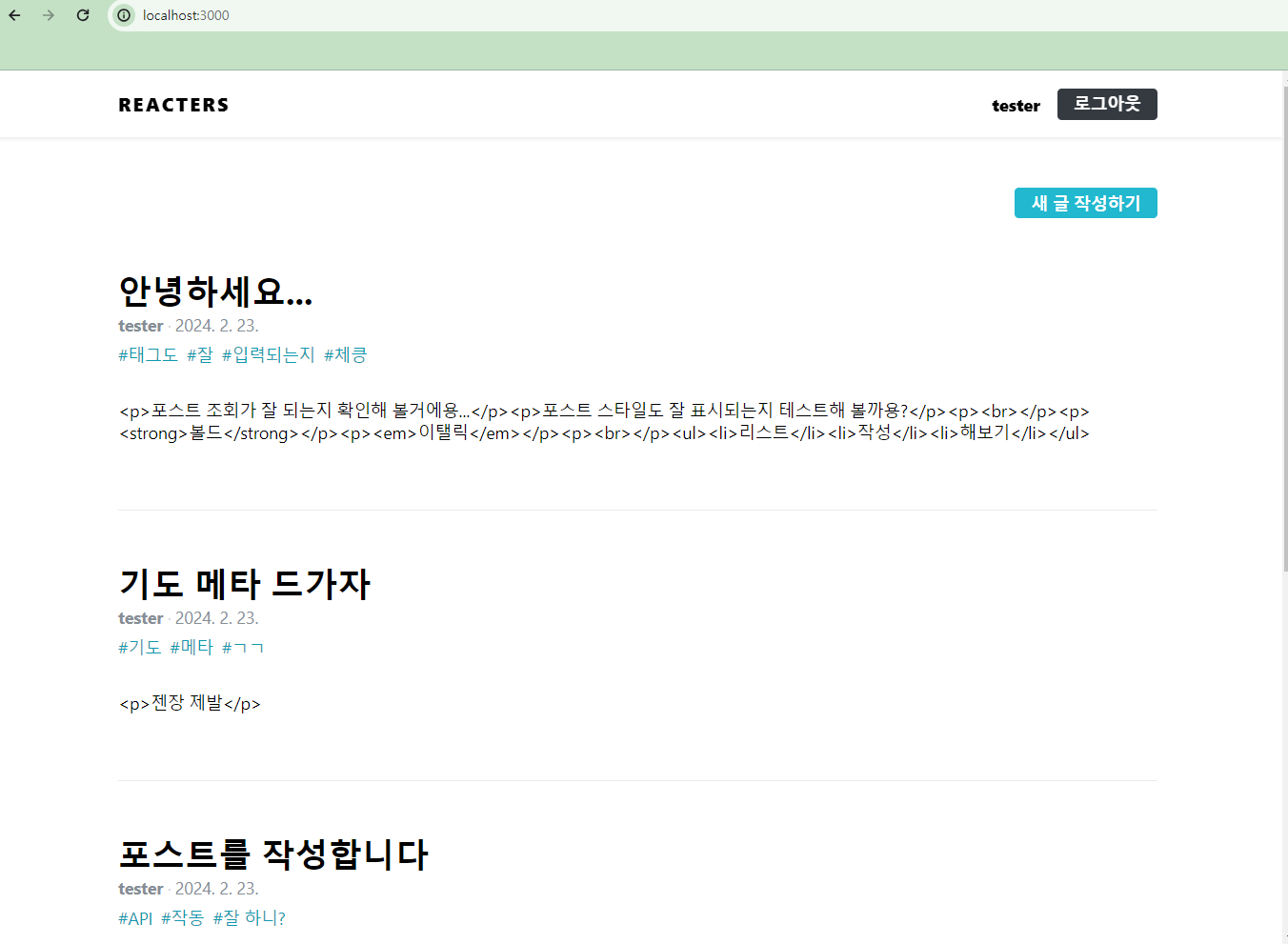 * 내용이 나타나는 부분에 HTML 태그가 그대로 보인다. 이 태그를 없애는 작업은 서버 쪽에서 해 주어야 한다. 물론 클라이언트에서 처리하는 방법도 있지만, 현재는 포스트 리스팅을 할 때 body의 글자수를 200자로 제한하는 기능이 있다. 이 때문에 완성된 HTML이 아니라 HTML의 일부분만 전달되어 HTML 태그를 없애는 작업이 잘 이루어지지 않을 가능성이 있다.