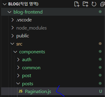 * 이제 리덕스 스토어 안에 마지막 페이지 번호를 lastPage라는 값으로 담아 둘 수 있다. 페이지네이션을 위한 컴포넌트 Pagination.js를 components/posts 디렉터리에 작성해 보자.