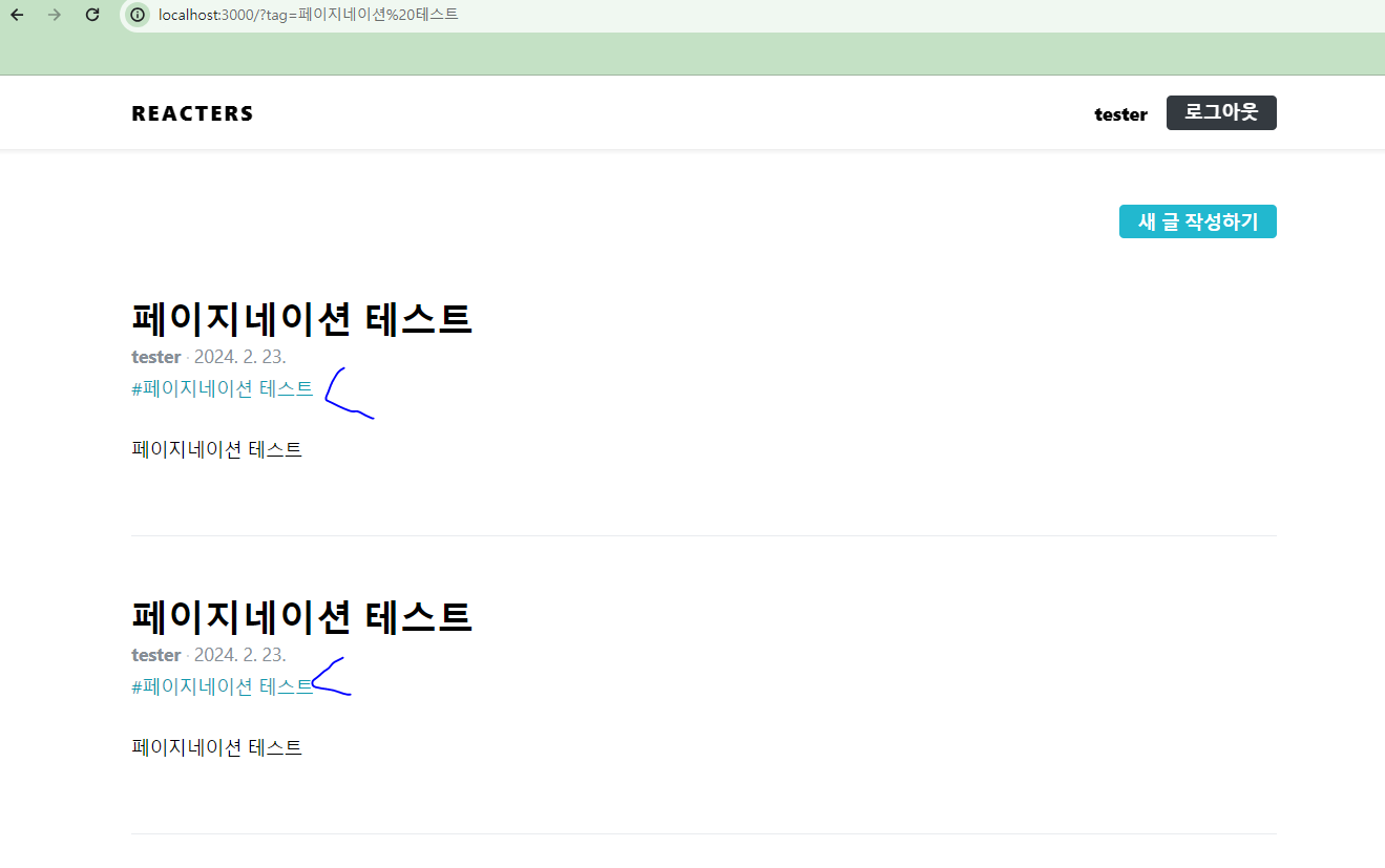 * 첫 번째 페이지일 때는 이전 버튼이 비활성화되고, 마지막 페이지일 때는 다음 버튼이 활성화된다. 계정명이나 태그를 클릭하여 포스트 쿼리 시스템도 잘 작동하는지 확인해 보자.