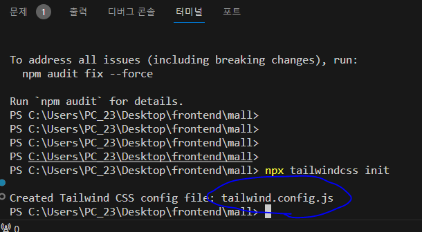* TailWind CSS 설정을 위해서 'npx tailwindcss init' 명령어를 실행하자.