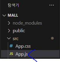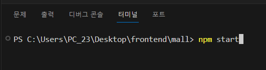 * VSCode가 mall 폴더에서 실행되면 메뉴 중에 터미널 메뉴를 실행해서 'npm start'를 이용해서 리액트 프로젝트를 실행할 수 있다(mall 폴더가 아래 그림과 같이 시작 경로가 되도록 주의한다).