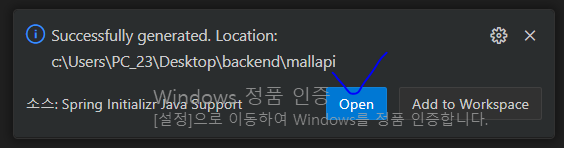 * 마지막으로 프로젝트 생성 경로는 미리 생성해 둔 backend 폴더를 지정한다. 프로젝트 생성이 완료되면 화면 오른쪽 구석에 생성한 프로젝트를 열 수 있는 링크가 보이게 된다.
