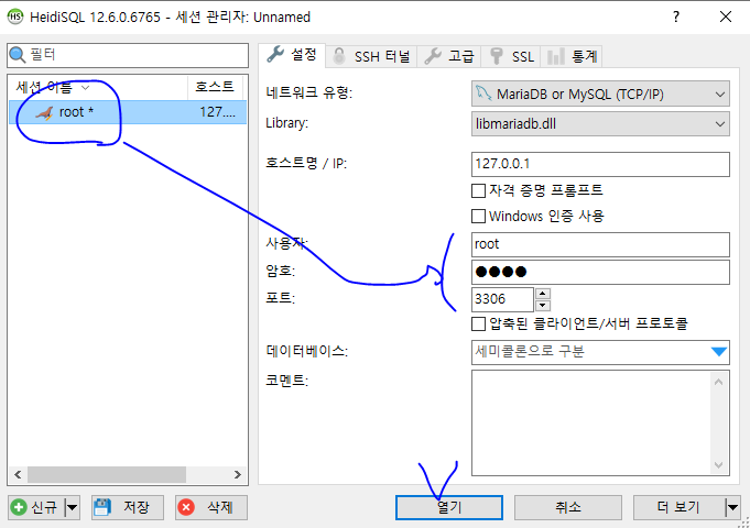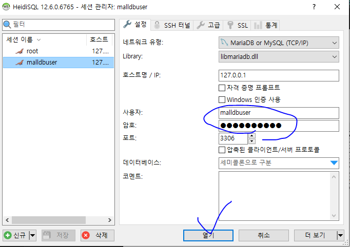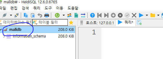 * 데이터베이스가 설치된 후에는 root 계정으로 로그인해서 필요한 스키마와 계정을 생성해 준다. 윈도우의 경우 데이터베이스 설치 시에 같이 설치되는 Heidisql 프로그램을 통해서 root 계정으로 데이터베이스 연결이 가능하다.