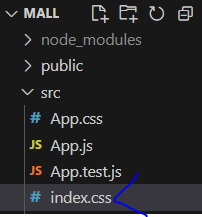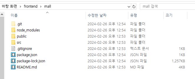 * 프로젝트가 생성되면 frontend 폴더 내부에는 mall 이라는 폴더가 생성되고 많은 파일이 만들어진 것을 확인할 수 있다.