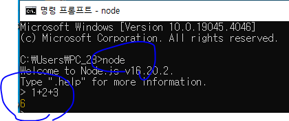 * node.js의 정상적인 설치 여부는 터미널 혹은 명령 프롬프트 환경에서 node라는 명령어를 실행해서 확인할 수 있다. 아래 화면은 node 명령어 실행 후 간단한 수식을 입력해서 실행 결과를 확인한 것이다(실행되는 node는 Ctrl + C 로 종료 가능).