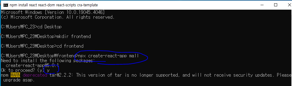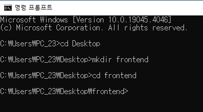 * 터미널 환경에서 'mkdir' 명령어를 치거나 탐색기로 frontend 이름의 폴더를 생성한다. 이후 'cd' 명령어를 통해 생성된 폴더로 이동한다.