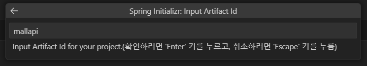 * Artifact Id 는 프로젝트 이름 역할을 하는데 예제에서는 mallapi라는 이름을 사용한다(프로젝트 패키지명의 일부가 되기 때문에 소문자로만 구성한다).