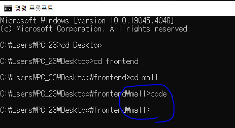 * VSCode 설치가 완료되었다면 frontend 폴더 내 mall 폴더로 이동해서 VSCode를 실행하는 'code .' 명령어를 실행한다(code는 VSCode를 실행하고 '.'은 현재 폴더를 의미한다).