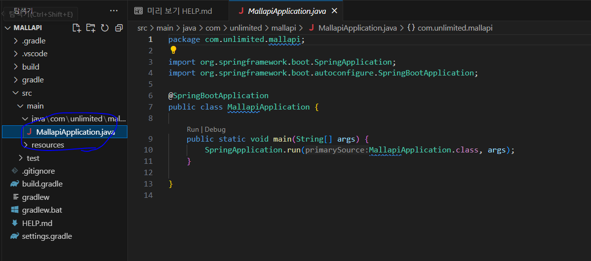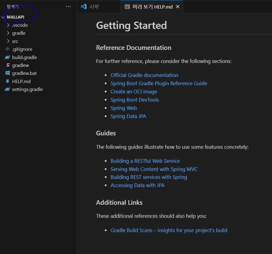 * 프로젝트 내 생성되어 있는 src 폴더 내에는 MallapiApplication.java 파일이 존재하는데 이를 실행해서 스프링 부트의 동작 여부를 확인할 수 있다(VSCode는 프로젝트의 초기화에 시간이 좀 걸린다). F11을 눌러도 실행된다.