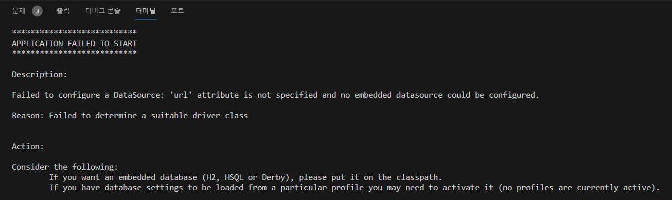 * 프로젝트의 첫 시작은 에러 메시지가 출력되는데 이는 스프링 부트의 설정이 자동으로 데이터베이스 관련 설정이 필요하기 때문이다.