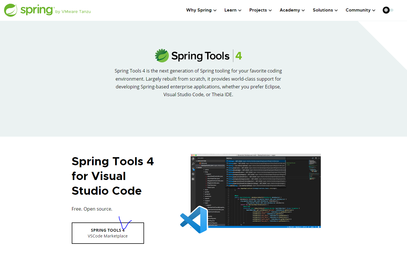 * 스프링 부트의 개발 역시 VSCode를 이용할 것이므로 VSCode에 STS(Spring Tool Suites)를 플러그인으로 설치해 주어야 한다. 아래 주소를 보면 VSCode용 플러그인을 제공하므로 링크를 통해 설치할 수 있다(STS 플러그인이 설치되면 내부적으로 여러 플러그인이 같이 설치되므로 다소 시간이 소요될 수 있다).
