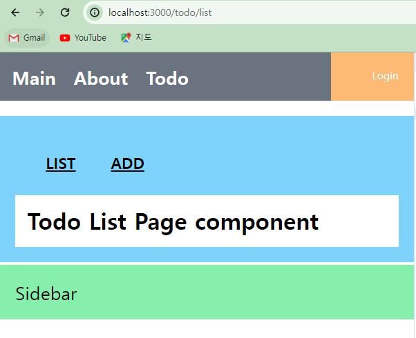 export default root;* 위의 설정을 적용하면 브라우저에서 'todo/list'로 접근할 경우 <Outlet> 부분이 ListPage 컴포넌트로 처리되는 것을 확인할 수 있다.
