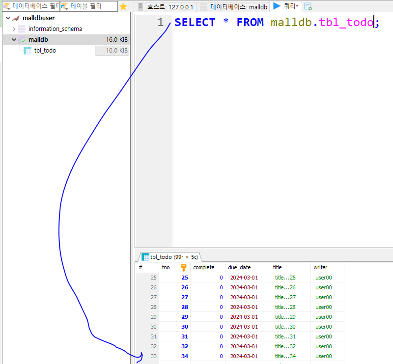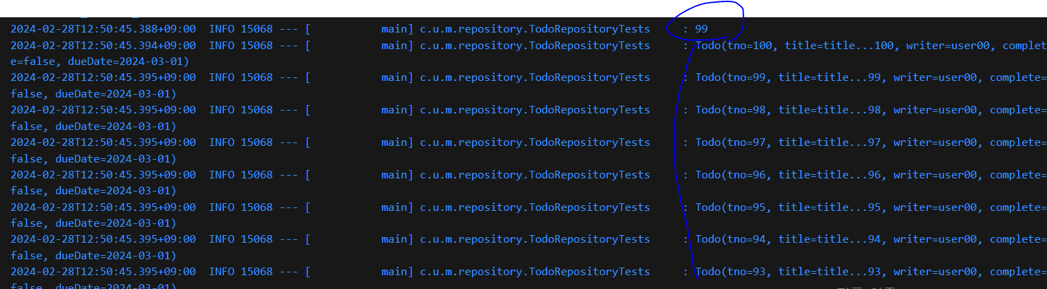* 테스트 결과로 99개의 데이터가 존재(앞에서 1개 삭제함)하고 tno의 역순(내림차순 정렬, descending)으로 정렬된 것을 확인할 수 있다.