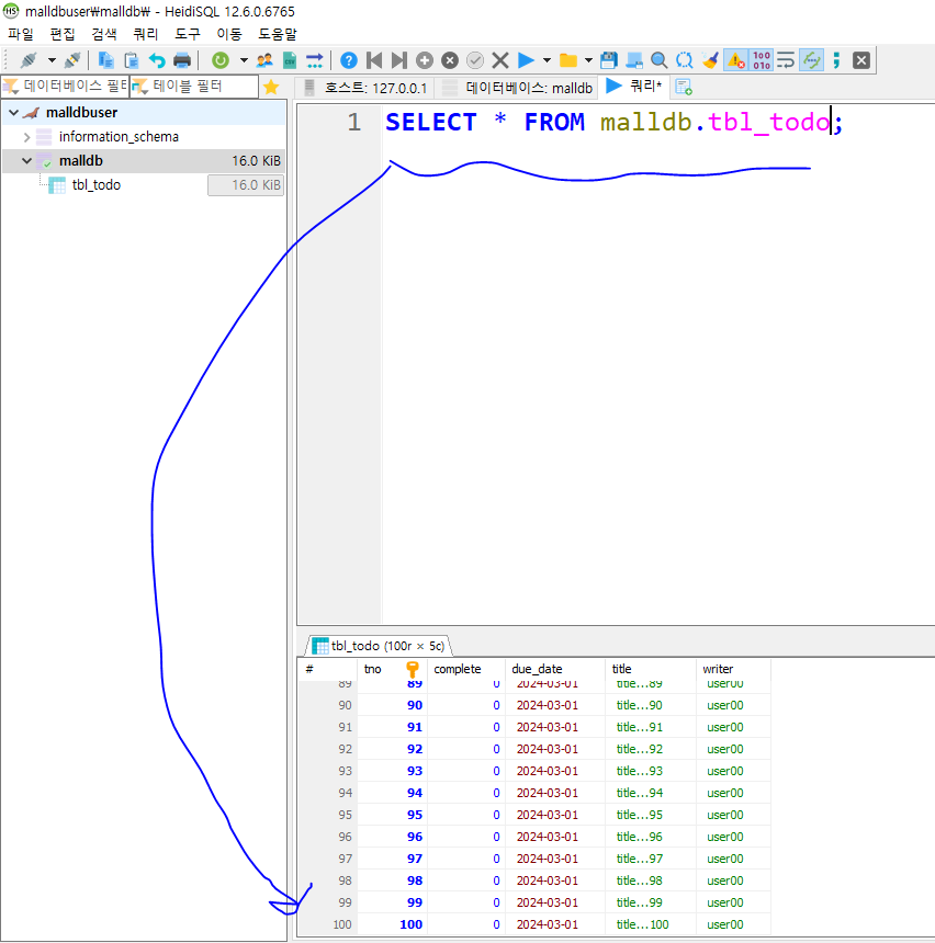 * 테스트 실행 후에는 데이터베이스에서 업데이트 결과를 확인해 보자.