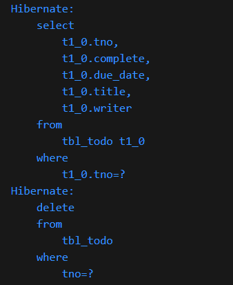 * 데이터의 삭제는 deleteById()로 쉽게 처리할 수 있다. 삭제의 경우도 먼저 데이터베이스에서 select를 수행한 후에 delete가 실행된다.