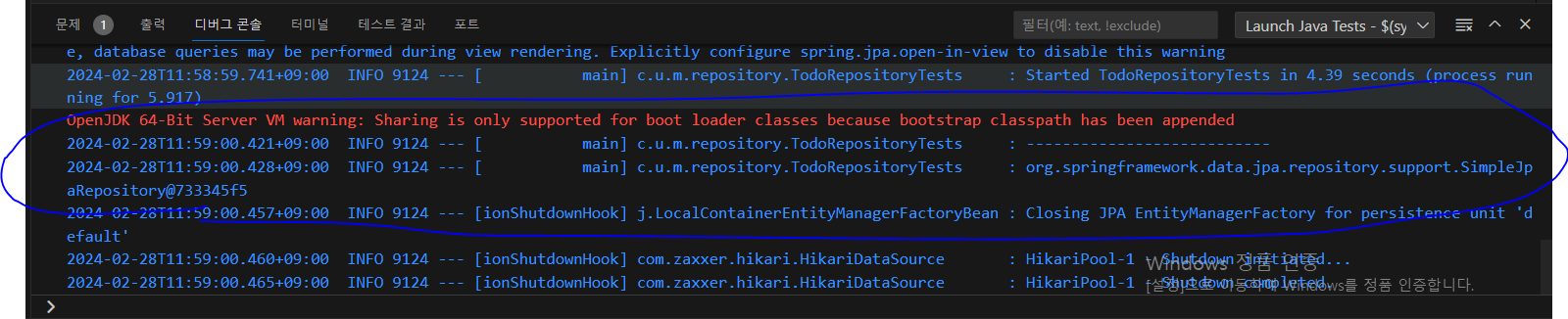 * 실행 결과로 TodoRepository 타입의 객체가 생성된 것을 확인한다(원래의 테스트 주도 개발 방식에서는 Assertions의 API를 활용하는 것이 좋지만, 예제에서는 눈으로 확인할 수 있도록 출력하는 방식을 이용한다).
