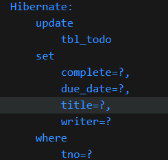 * Todo 엔티티 클래스에서는 수정이 가능한 부분에 대해서 변경 가능하게 수정한다. Todo의 제목(title)이나 완료 여부(complete), 만료일(dueDate) 등은 수정할 수 있다.