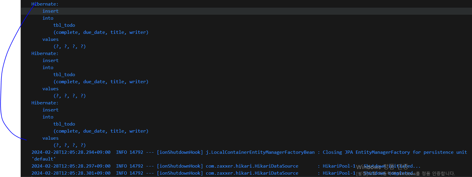 * testInsert()가 실행되면 100개의 insert 문이 실행되는 것을 확인할 수 있다.