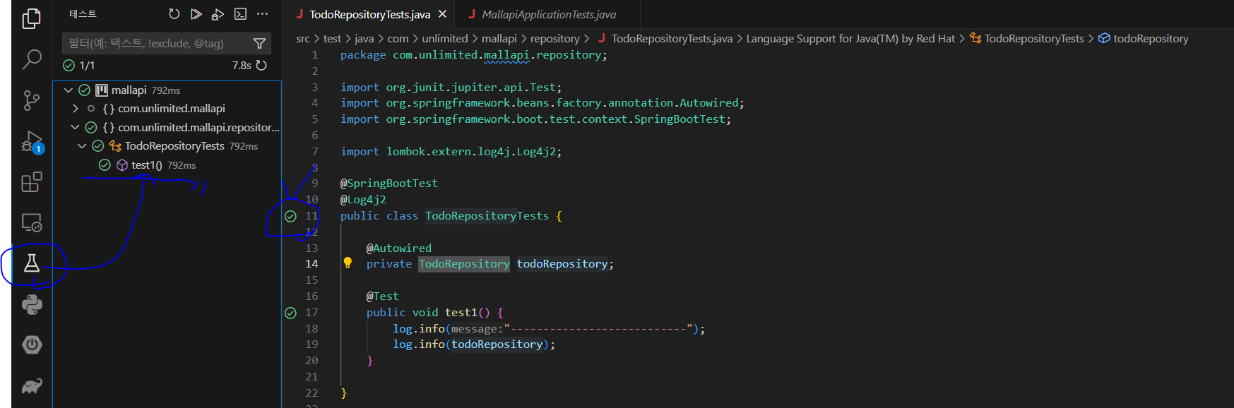 * 테스트 메서드는 메서드 오른쪽의 표시를 이용해서 실행하거나 VSCode 오른쪽에 있는 메뉴 중에 테스트 메뉴에서 test1()을 확인하고 실행할 수 있다.