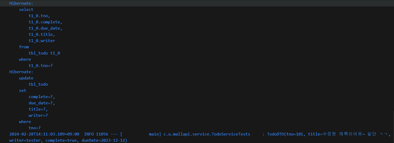 }* TodoServiceImpl에서 수정 기능의 구현은 기존의 Todo를 먼저 로딩한 후에 TodoDTO에서 변경된 내용(title, complete, dueDate)을 반영하고 다시 저장하는 방식으로 구현된다.