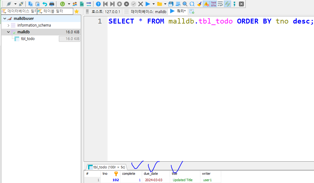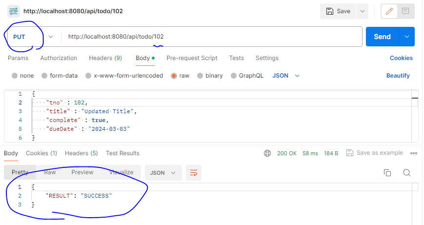 * Todo의 수정은 PUT 방식으로 한다. 수정될 수 있는 필드는 제목(title), 완료여부(complete), 만료일(dueDate)이다. TodoController에 @PutMapping으로 메서드를 추가한다.