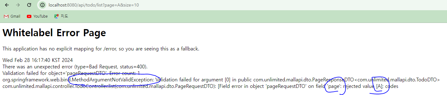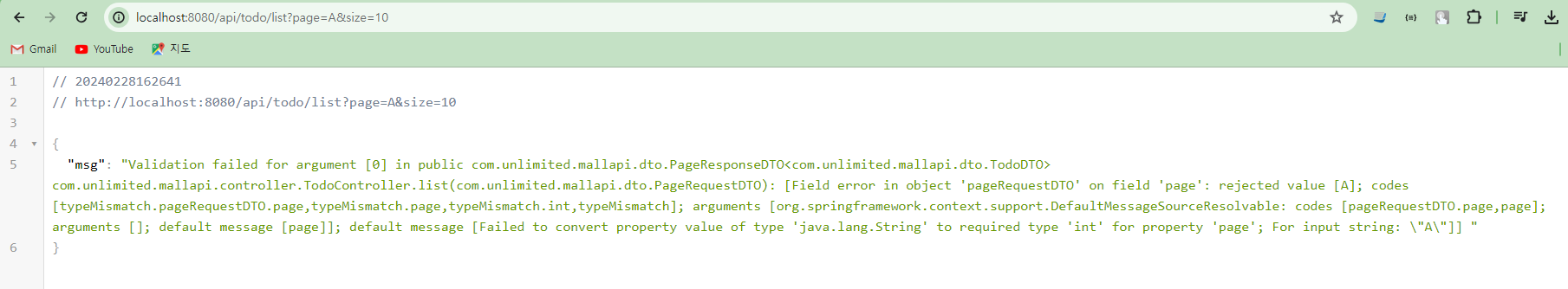 * 또한 페이지 번호를 숫자가 아닌 문자로 전달하면 MethodArgumentNotValidException 에러가 발생한다.