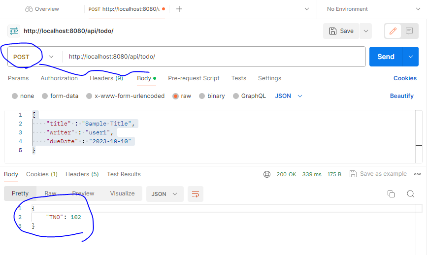 * 프로젝트를 실행하고 Postman을 사용해서 POST 방식으로 JSON 데이터를 전달해서 동작 여부를 확인한다. 실행 결과로는 새로운 번호(tno)가 생성된다.