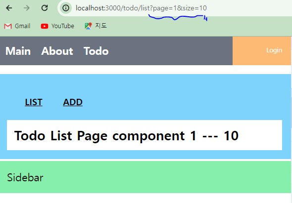 * 화면에서 ReadComponent는 하단 오른쪽에 'List' 버튼이 생성되고 클릭 시에 '/todo/list' 로 이동하게 된다. '/todo/list'로 이동할 때 'page=1&size=10'이 자동으로 처리된다.