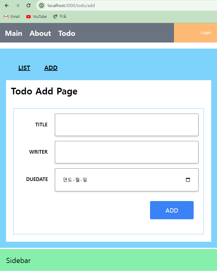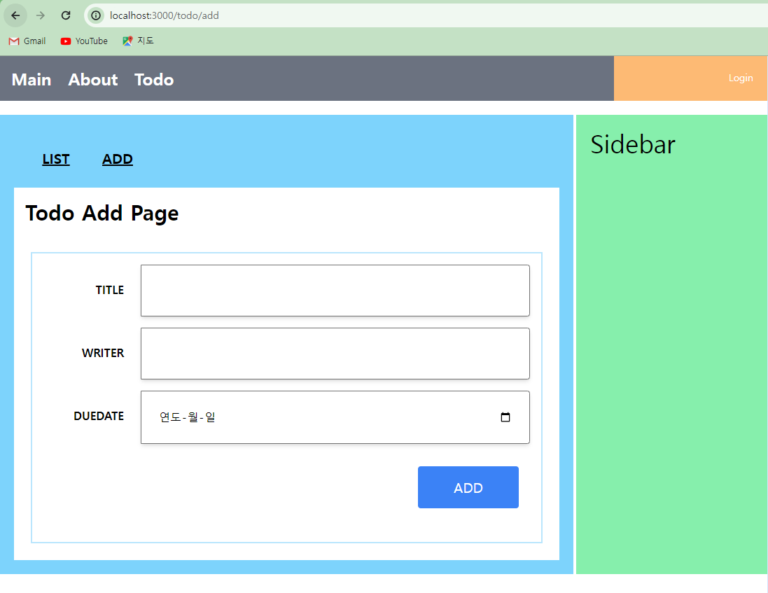 * 아직 화면 구성은 완료되지 않았기 때문에 브라우저에서 '/todo/add'는 다음과 같은 모습으로 보이게 된다.