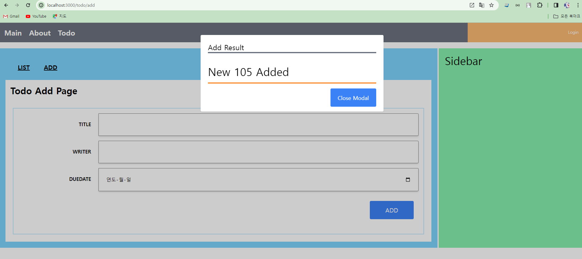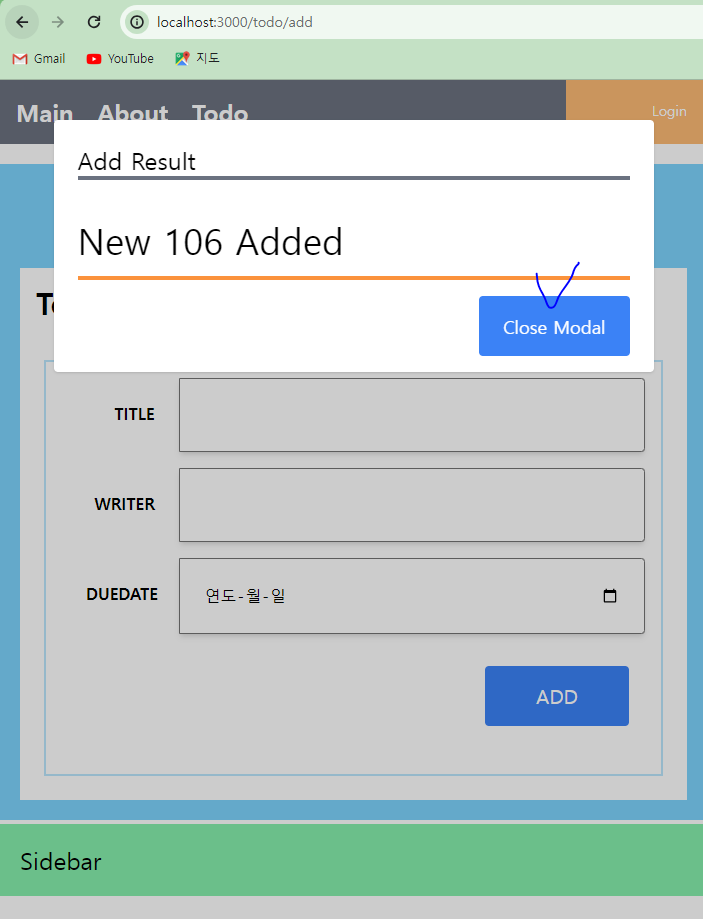 * 등록 처리는 입력하는 화면이 있고, 버튼을 클릭하면 서버를 호출하고 호출 결과를 모달창에서 현재 화면을 보여주도록 구성한다. 등록 처리용 페이지는 pages/todo/AddPage.js를 이용하고 해당 페이지에서 사용할 컴포넌트를 components/todo/AddComponent.js 파일로 추가한다.