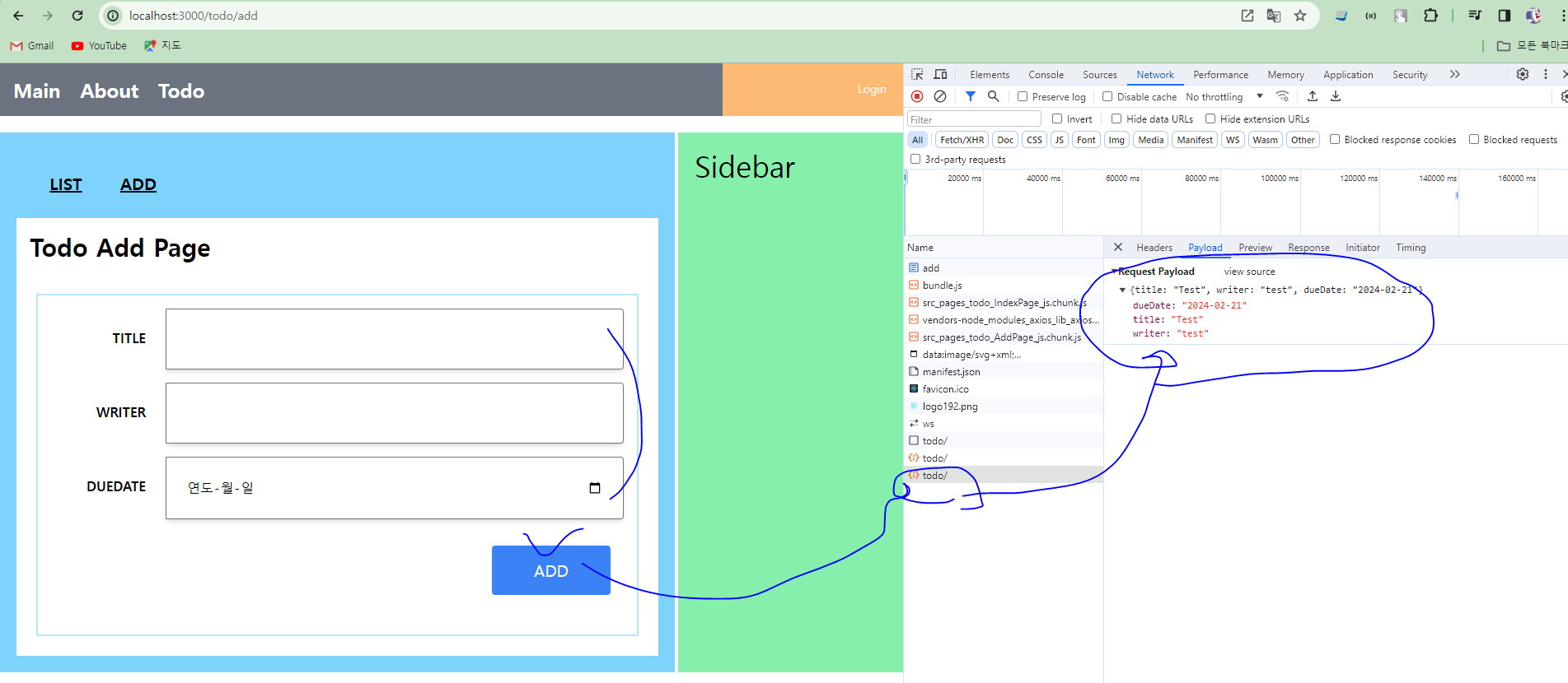 * 개발자 도구에서 'Network' 탭을 통해서 'ADD' 버튼을 클릭했을 때 서버를 호출하는 것을 확인한다.