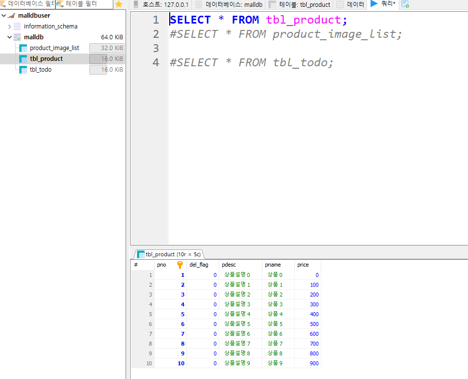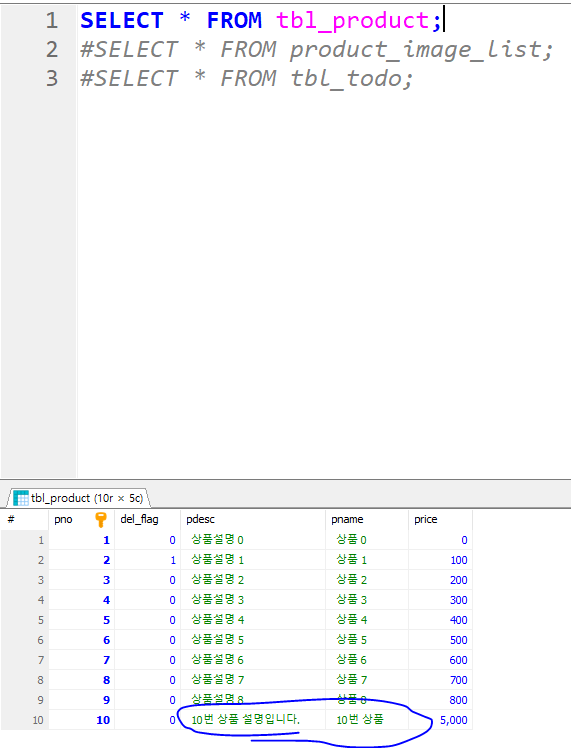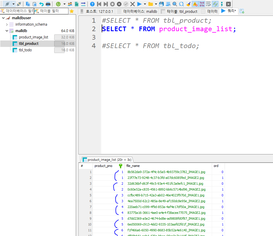 * 데이터베이스에서 최종적으로 수정된 결과를 확인한다. 상품의 설명이나 가격이 변경된 것을 확인하고 상품 이미지도 3개로 변경된 것을 확인한다.