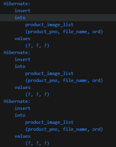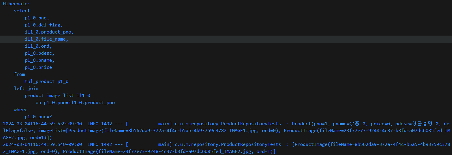 }* testList()를 실행하면 left join 처리가 된 쿼리가 실행되는 것을 확인할 수 있고, Product와 ProductImage가 배열로 만들어진 것을 확인할 수 있다.