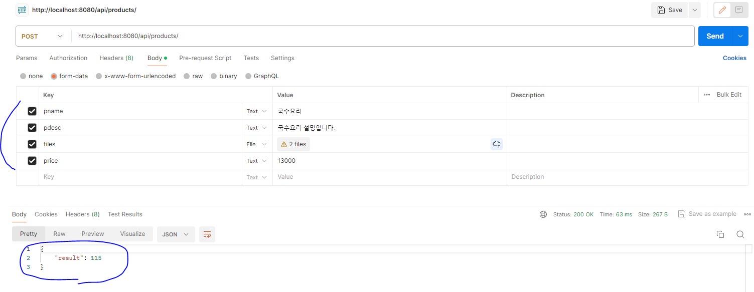 * 컨트롤러까지 연동된 결과를 확인하기 위해서 Postman을 이용해서 먼저 두 개의 이미지를 가지는 새로운 상품 하나를 추가한다.