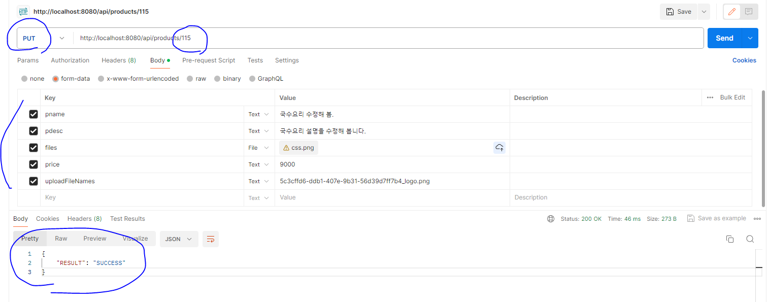 * 다양한 상황에서 가장 주의해야 하는 것은 '기존의 파일 중 일부만 유지하고 새로운 파일이 추가된 경우' 이다. Postman에서는 PUT 방식으로 '/api/products/상품 번호'를 지정하고, uploadFIleNames 항목에는 기존에 업로드된 파일의 이름을 넣어주고 files 항목에는 새로운 이미지들을 추가해 본다.