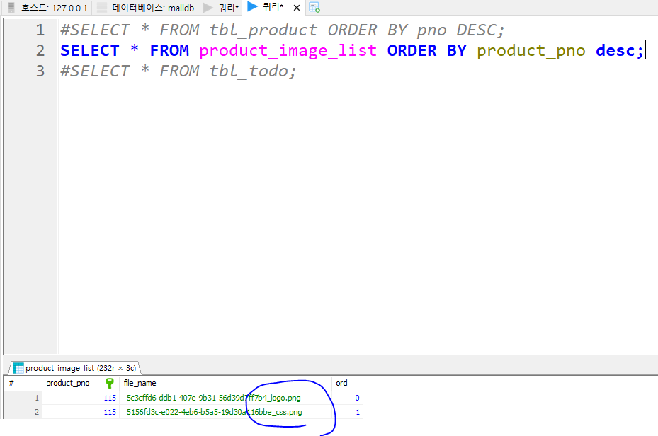* 데이터베이스에도 정상적으로 모든 내용과 첨부파일의 정보가 처리된 것을 볼 수 있다.